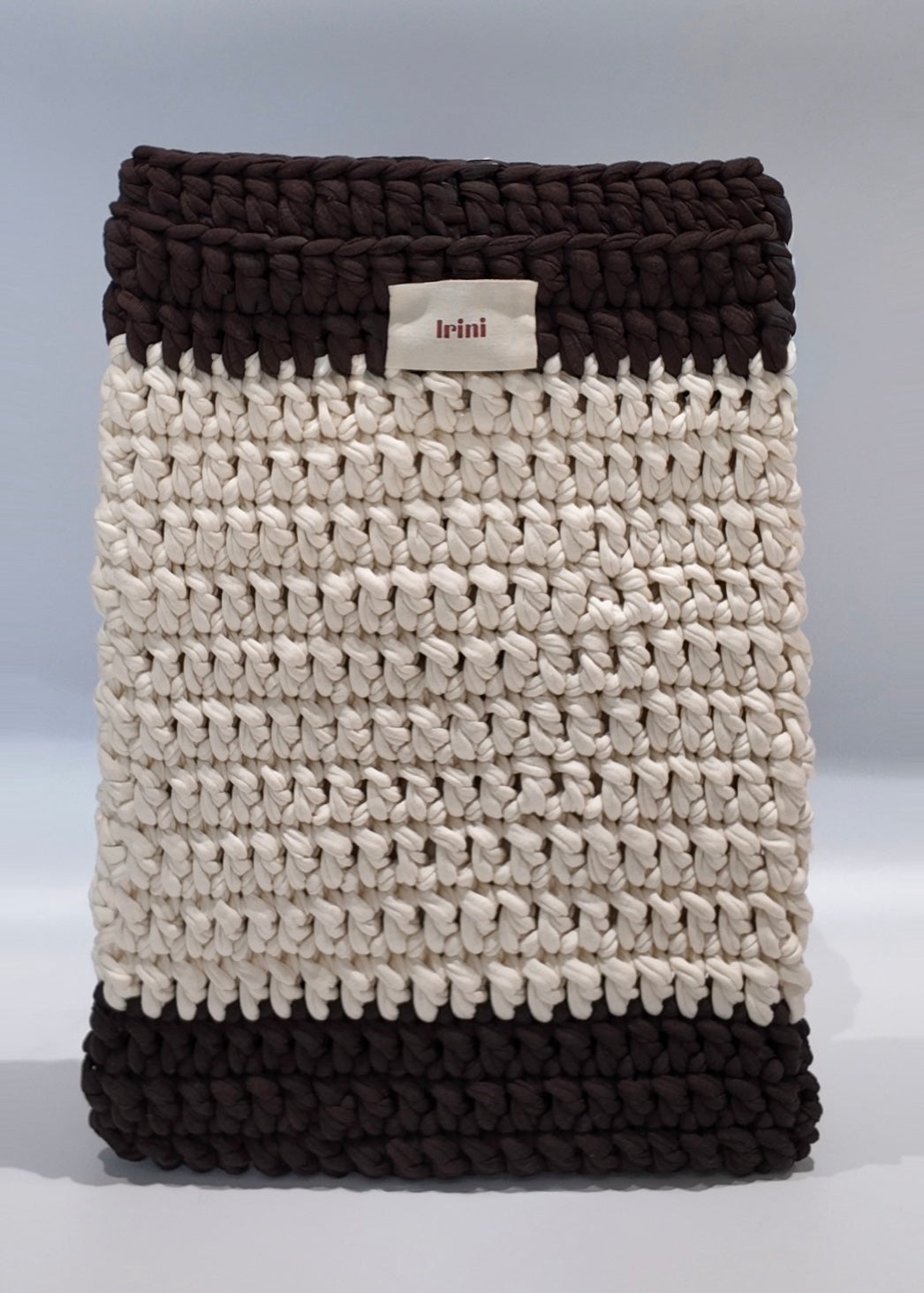Conçu en fils de t-shirt, nos sacs sont créés minutieusement à la main. Les nuances de couleur et les légères irrégularités témoignent de l’authenticité des matériaux naturels.
